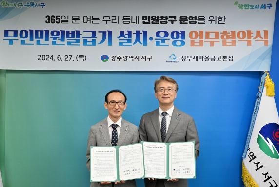 광주광역시 서구와 상무새마을금고가 주민들의 민원 편의 증진을 위해 손을 맞잡았다. 양 기관은 27일 상무새마을금고 본점 내 무인민원발급기를 신규 설치하고, 상호 협력관계를 바탕으로 효율적인 운영을 위해 업무협약을 체결했다.