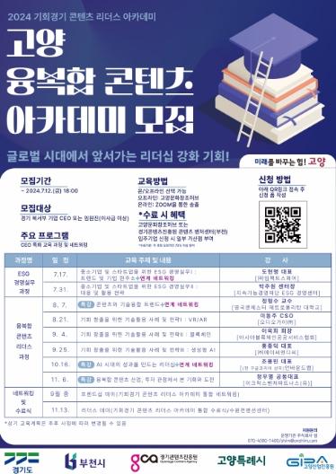 ‘고양 융복합 콘텐츠 아카데미’는 경기 북서부 산업계 리더의 역량 강화를 위한 교육 프로그램이다. 주요 내용은 ESG 경영과 최신 기술을 활용한 비즈니스 전략 등에 관한 특강과 교육, 네트워킹으로 구성되며, 각 분야의 전문가들이 강사로 참여하여 심도 있는 강의와 생생한 산업계 이야기를 전할 예정이다.