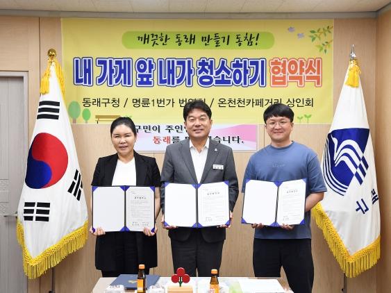 부산 동래구는 지난 24일 명륜1번가 번영회 및 온천천 카페거리 상인회와 깨끗한 동래만들기 동참을 위한 “내 가게 앞 내가 청소하기” 협약식을 진행했다고 밝혔다.