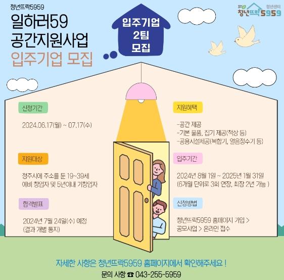 청주시 청년센터 청년뜨락5959(이하 청년뜨락5959)는 ‘2024 청년뜨락5959 일하러59 공간지원사업 입주기업’을 모집하고 있다고 27일 밝혔다.
