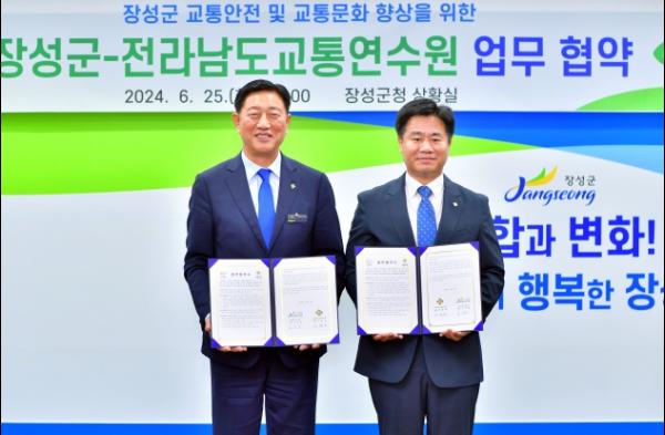 장성군과 전라남도교통연수원이 지난 25일 장성군청 상황실에서 교통안전을 위한 업무협약을 체결했다. 김한종 장성군수, 이병희 전라남도교통연수원장이 참석해 교통사고 예방, 선진 교통문화 정착을 위한 상호 협력을 다짐했다.