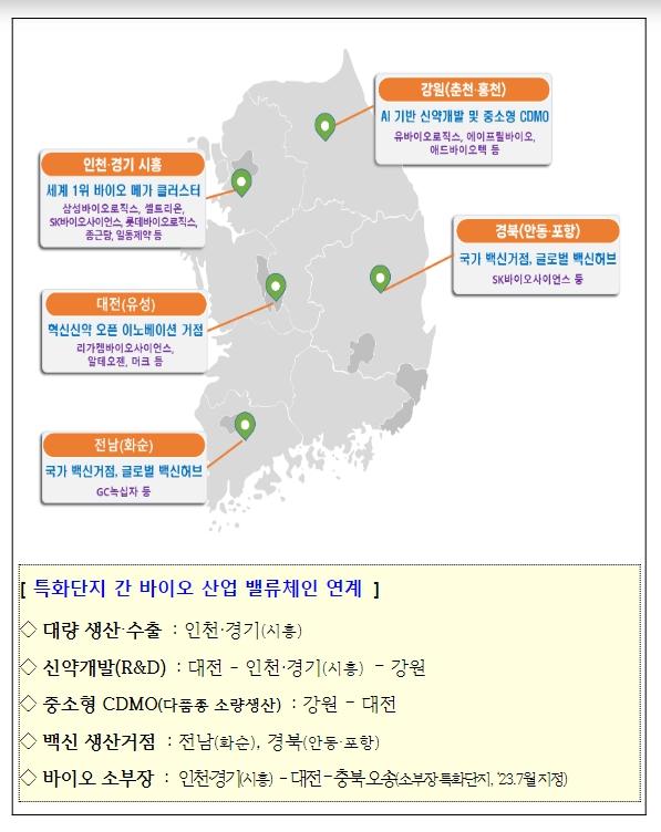 정부는 바이오 특화단지 공고기간(’23.12~’24.2) 동안 신청한 총 11개 지역을 대상으로 첨단전략산업 관련 선도기업 및 투자규모, 산업생태계 발전 가능성과 지역 균형발전 등을 고려하여 평가한 결과, 인천?경기(시흥), 대전(유성), 강원(춘천?홍천), 전남(화순), 경북(안동·포항)의 5개의 바이오 국가첨단전략산업 특화단지를 지정했다.