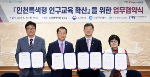 인천광역시는 6월 27일 시청 접견실에서 보건복지부, 인천시교육청, 인구와미래정책연구원과 ‘인천특색형 인구교육 확산 업무협약’을 체결했다고 밝혔다.