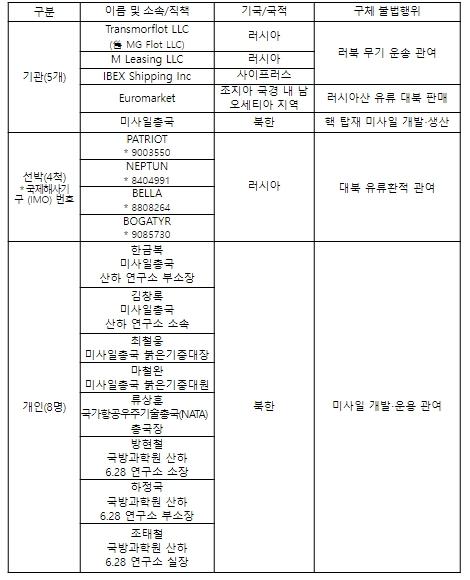 우리 정부는 북한과 러시아가 안보리 결의를 위반한 군사협력을 지속하는 가운데, 6월 19일 푸틴 대통령 방북시 '포괄적인 전략적 동반자 관계에 관한 조약'을 체결하여 상호 군사, 경제적 협력을 강화하기로 함으로써 우리의 안보 이익을 위협함에 따라, 이에 대한 대응조치로서 러북 간 무기 운송, 대북 정제유 반입 및 북한 핵·미사일 개발 등 불법행위에 관여한 러시아, 북한 및 제3국 기관 5개, 선박 4척 및 개인 8명을 7월 1일자로 대북 독자제재 대상으로 지정하기로 했다.