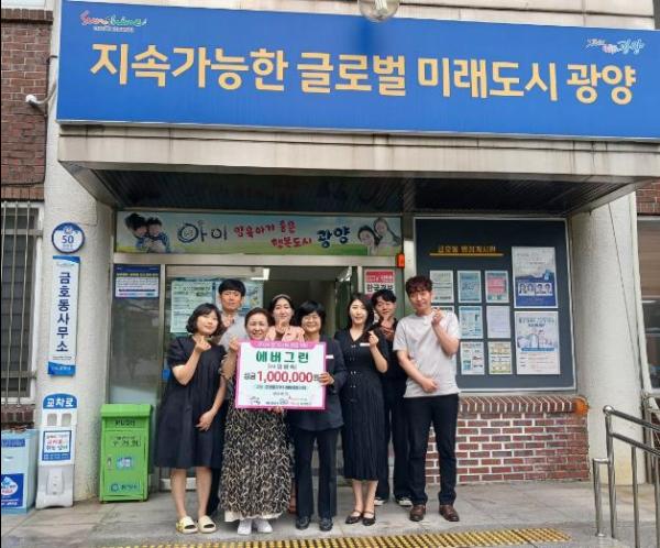 광양시 금호동 에버그린은 27일 금호동사무소에서 어려운 이웃을 위해 써달라며 성금 100만원을 광양시 사랑나눔복지재단에 기탁했다고 밝혔다.