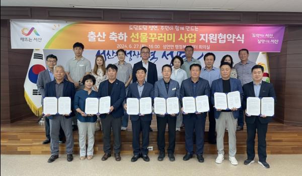 성연면은 27일 성연면 행정복지센터 회의실에서 기관?단체장 7명이 참석한 가운데 '도담도담 성연, 출산 축하 선물꾸러미 사업' 추진을 위한 5차 협약을 맺었다고 밝혔다.