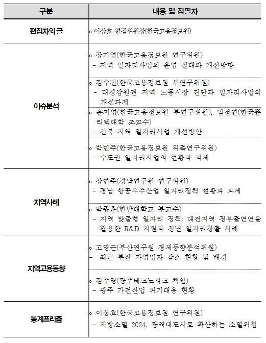 이번 여름호는 ‘지역 산업맞춤형 일자리사업의 성과와 과제’를 기획 주제로 내세워 지역의 일자리 사업과 관련 최근 지역의 고용 이슈를 집중적으로 파헤쳤다. 또한 통계청의 『주민등록인구통계』를 이용해 2024년 3월 기준 소멸위험지역의 현황과 특징도 담았다.