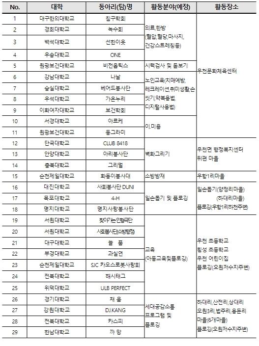 올해는 대학생 봉사단체 200여 명이 참여하며, 7월 1일(월) 발대식을 시작으로 의료활동(한방), 물리치료, 마을 벽화 그리기, 머리 손질, 안경(돋보기) 맞추기, 소방 안전 점검, 아동교육 프로그램, 농촌 일손돕기 등 다양한 활동을 전개할 예정이다.
