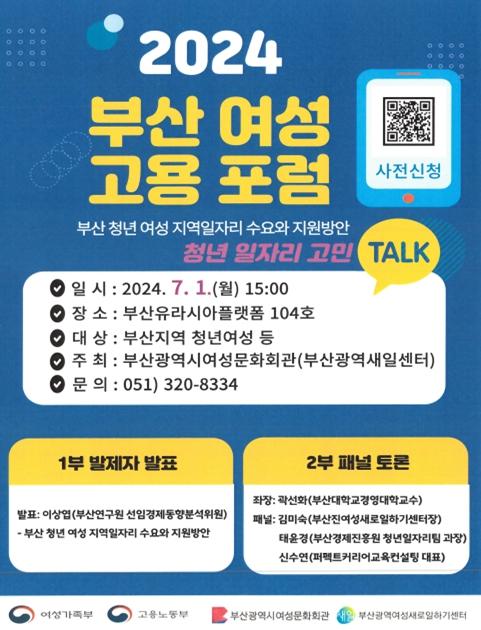 부산시 여성문화회관은 오늘(1일) 오후 3시 부산유라시아플랫폼 104호에서 '2024 부산 여성고용 포럼'을 개최한다고 밝혔다.
