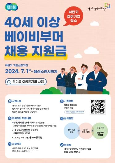 경기도와 경기도일자리재단이 도내 베이비부머(40~64세) 세대에게 일 경험과 일자리를 제공하기 위해 추진하고 있는 '경기도 이음 일자리 사업'에 참여할 도내 중소기업, 중견기업, 사회적 기업을 모집한다.