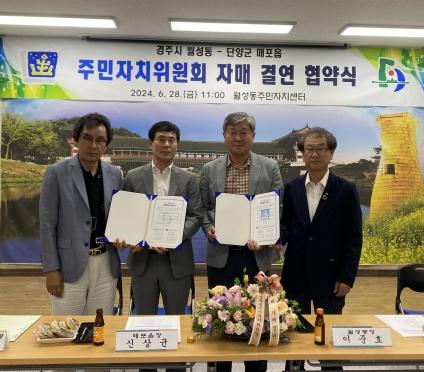경주시 월성동 주민자치위원회와 충청북도 단양군 매포읍 주민자치위원회는 지난달 28일 양 지역의 발전과 상호 교류를 통한 주민복지 향상을 위해 자매결연 협약을 체결했다.