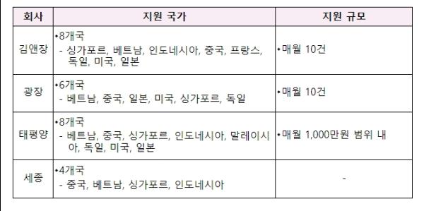 법률회사별로 해외 사무소가 있는 국가뿐만 아니라, 일본, 베트남, 인도네시아, 싱가포르 등 최근 창업기업(스타트업)의 해외 진출이 활발한 9개국이 주요 지원 대상 국가이다.