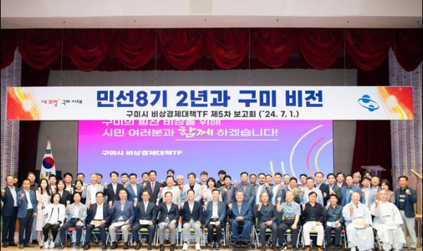 구미시는 지난 1일 비상 경제 대책 TF 협의회 및 자문단, 기관단체장 등 160여 명이 참여한 가운데 '구미시 비상 경제 대책 TF 5차 보고회' 를 개최했다.