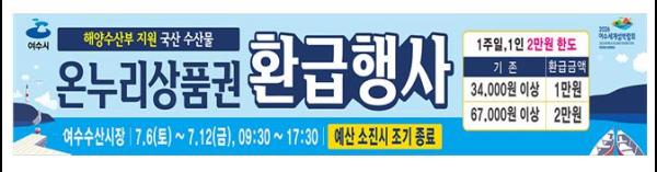 여수수산시장에서 오는 6일부터 12일까지 수산물을 구입하면 구매금액별 최대 2만 원까지 온누리상품권으로 환급받을 수 있다.