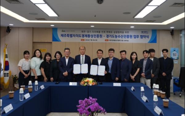 제주특별자치도경제통상진흥원은 경기도농수산진흥원과 상호 운영하는 지자체몰(이제주몰-제주, 마켓경기-경기)을 통한 연계 판매로 도내 생산농가의 판매활성화를 추진하기 위한 업무협약(MOU)을 체결했다고 2일 밝혔다.