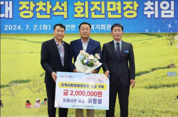 위정성 프레시안 광주전남본부 국장은 지난 2일 제20대 장흥군 회진면장 취임식에서 이웃돕기 성금 200만 원을 기탁했다.