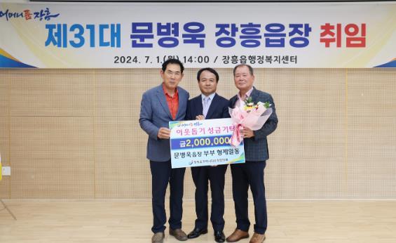 지난 1일 문병욱 장흥읍장 취임식에서 문병욱 읍장 부부와 형제가 이웃돕기 성금 2백만 원을 장흥읍지역사회보장협의체에 기탁했다.