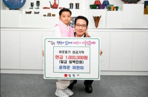 남원시는 3일 도통초 윤하준 어린이와 부모님이 남원시청을 찾아와 이웃돕기 성금 1백만원을 기부했다고 밝혔다.