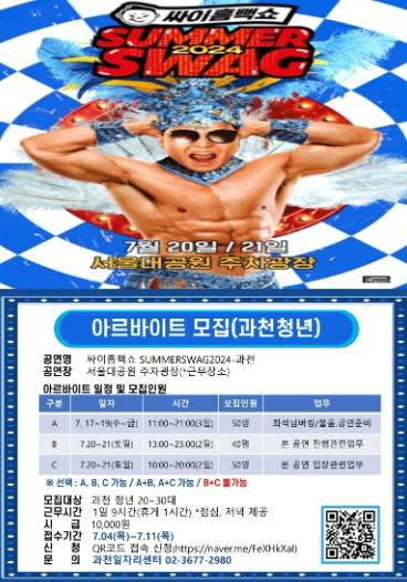 과천시는 가수 싸이의 ‘흠뻑쇼’ 공연이 오는 20일, 21일 2일간 과천 서울대공원 주차광장에서 열리는 가운데, 공연장 아르바이트생 채용에 있어 과천 청년을 우선적으로 선발한다고 3일 밝혔다.