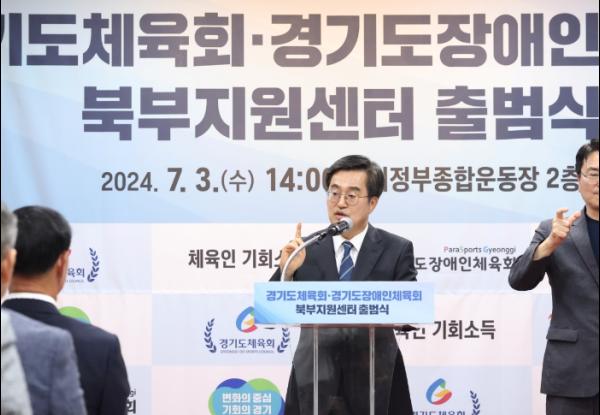 김동연 경기도지사는 3일 경기도체육회·경기도장애인체육회 북부지원센터(이하 북부지원센터) 출범을 축하하며 “경기남부와 북부의 격차를 좁히는 것이 도정 방향인데 오랫동안 가지고 있었던 염원을 달성했다”고 말했다.