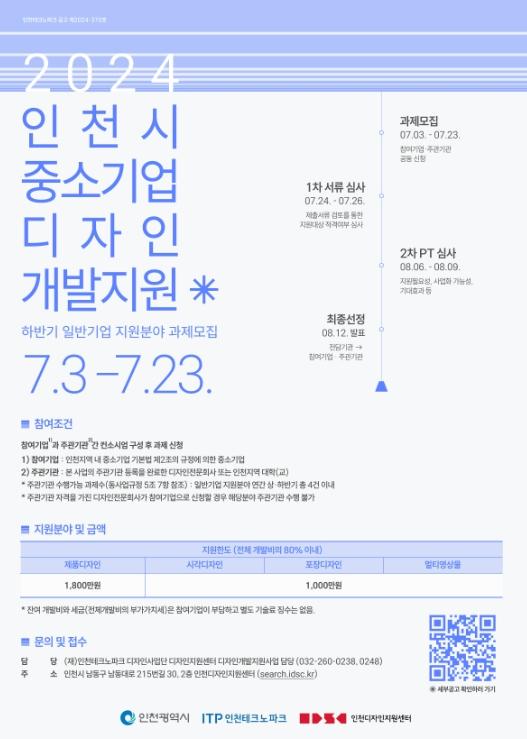 지원신청은 7월 23일 화요일까지 인천디자인지원센터 누리집을 통해 접수하며, 자세한 내용은 인천TP 담당자에게 문의하면 된다.