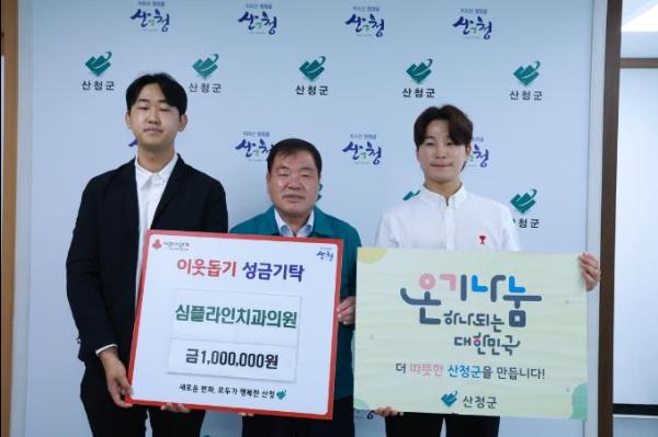 산청군은 지난 3일 심플라인치과의원이 군청을 찾아 이웃돕기 성금 100만원을 기탁했다고 4일 밝혔다.