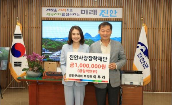 진안군의회 이루라 부의장이 4일 진안군청 군수실에서 진안사랑장학재단에 장학금 100만원을 전달하는 기탁식을 가졌다.