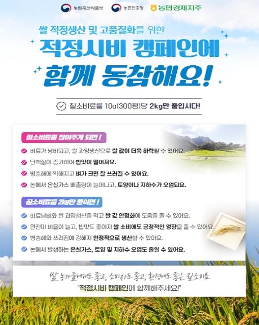 시 관계자는 “고품질 쌀 생산을 위해 질소질 비료를 2kg만 줄여도 쌀 과잉생산을 막아 쌀값 안정화에 도움이 되며, 밥맛도 좋아져 쌀 소비에 긍정적인 영향을 줄 수 있다”고 말했다. 또한, “7월 잦은 비 소식이 예정되어 있어 병해충 발생이 우려되므로 관내 벼 재배 농가들이 질소질 비료 적정?적량 시비에 적극적으로 참여해달라?고 당부했다.