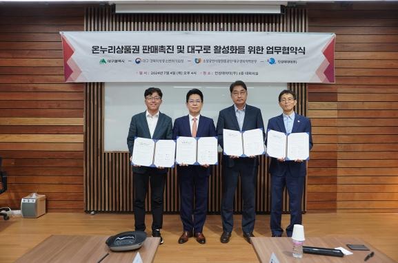 대구광역시는 ‘대구로’ 운영업체인 인성데이타, 소상공인 지원기관인 대구경북지방중소벤처기업청과 소상공인시장진흥공단 대구경북지역본부와 ‘온누리상품권 판매촉진 및 대구로 활성화를 위한 업무협약’을 7월 4일 인성데이타 대회의실에서 체결했다.