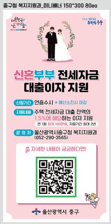울산 중구가 7월 1일부터 10월 30일까지 2024년 하반기 신혼부부 주택 전세자금 대출이자 지원 신청을 받는다.