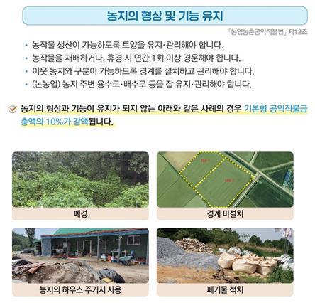 또한, 의무준수사항 중 여러 항목을 이행하지 않았을 경우에는 각 감액율이 합산되어 불이익을 받을 수 있으니 각 농가는 공익직불금을 100% 받을 수 있도록 의무 준수사항을 반드시 실천할 것을 당부하였다.