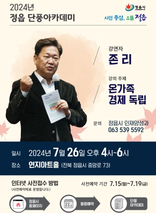 정읍시는 오는 26일 오후 4시 연지아트홀에서 금융인 존 리를 초청해 제112회 정읍 단풍아카데미를 개최한다.