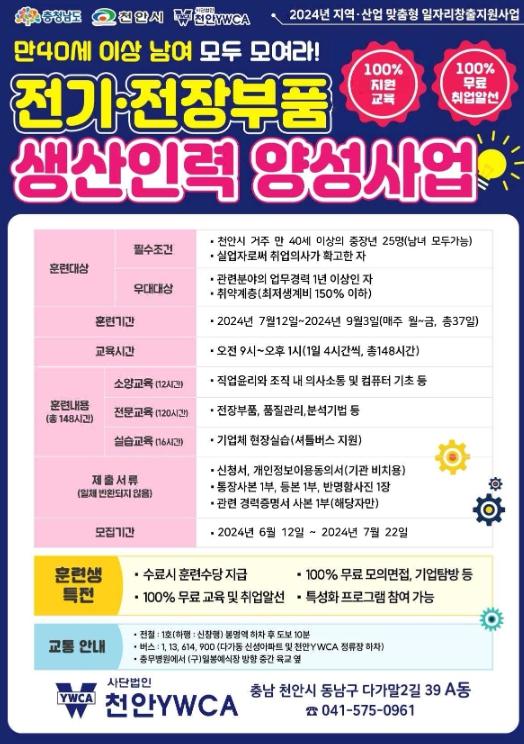 천안시는 중장년층을 대상으로 전기·전장부품 생산인력 양성을 위한 제2기 무료교육을 실시한다고 5일 밝혔다.