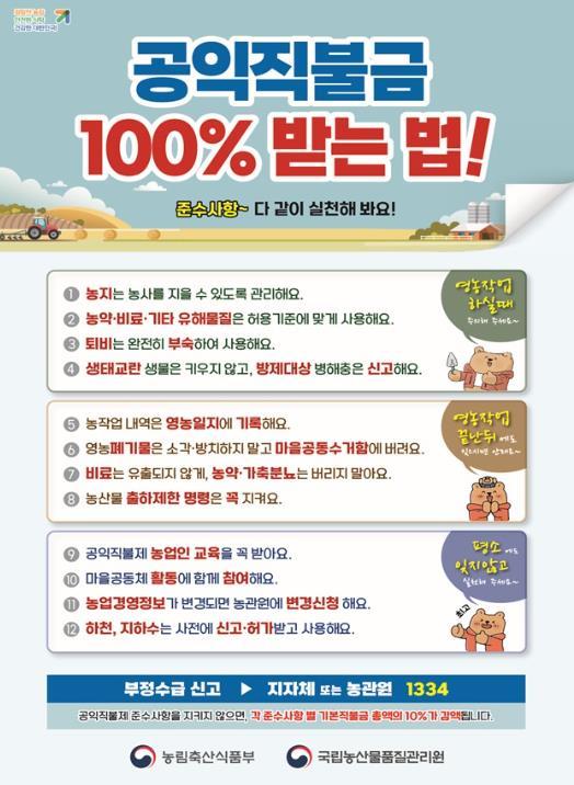 직불금을 100% 받기 위해서는 농가가 법령에서 정한 17가지 의무 준수사항을 모두 실천해야 한다.