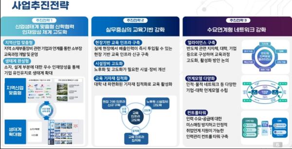 지역기업 수요를 기반으로 △특성화 교육과정 개발과 운영 △교육 및 실습환경 구축 △반도체 분야 취업?진학(대학원) 활성화 등 산학 일체형 소재?부품 인력 양성 생태계 구축이 핵심이며, 4년간 1,500명의 인재 양성을 위한 국비 280억 원을 지원받는다.