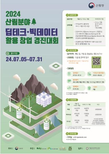 산림청은 산림분야 공공데이터를 활용한 창의적인 아이디어를 발굴하기 위해 ‘2024 딥테크·빅데이터 활용 창업 경진대회’를 개최한다고 5일 밝혔다.