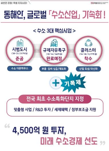 지난해 12월 기재부 예비타당성 조사를 통과해 타당성을 검증받은 클러스터(3,177억원)는, 동해는 산업진흥센터를 비롯해 안전성시험센터, 실증테스트베드를 구축해 산업육성에 나서며, 삼척은 수소액화플랜트(30톤/일)로 수소공급공간으로 조성해 동해삼척 수소 저장·운송 산업기반을 마련한다.