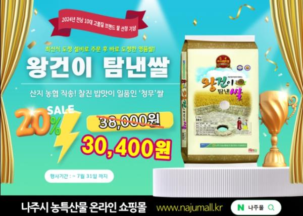 전라남도 나주시가 농특산물 온라인 쇼핑몰 ‘나주몰’에서 오는 31일까지 ‘왕건이 탐낸 쌀’의 전남 10대 고품질 브랜드 쌀 선정 기념 특판행사를 진행한다고 8일 밝혔다.