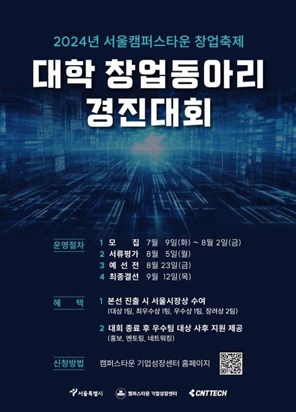 대학 창업동아리 경진대회는 예비창업자 또는 1년 이내의 기 창업자도 신청이 가능하며, 서울 소재 대학(원)생이라면 누구나 창업동아리 소속이 아니더라도 개인 또는 팀 단위로 신청할 수 있다. 참가 신청은 7월 9일부터 8월 2일 17시까지 캠퍼스타운 기업성장센터 누리집에서 할 수 있다.