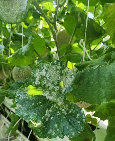 멜론 흰가루병 증상은 아랫잎의 표면 또는 뒷면에 흰가루를 뿌린 듯한 원형 병반이 형성되고 점차 윗부분으로 진행되는 것으로 심하면 잎 전체가 말라 죽는다.