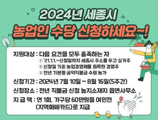 지원 대상은 2024년 1월 1일 기준 2021년 1월 1일부터 신청일까지 세종시에 주소를 두고 실 거주하면서 농업경영체를 등록한 경영주로, 전년도 기본형 공익직불금 수령 농가다.