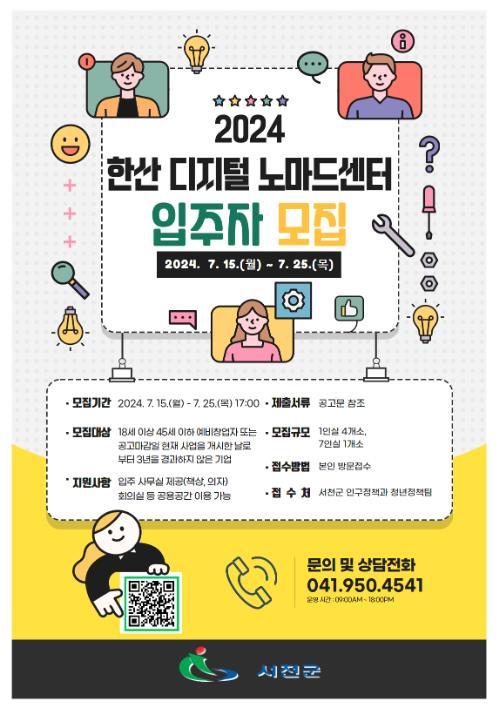 서천군은 청년 창업가의 자립과 안정적인 정착을 돕고자 오는 15일부터 25일까지‘한산 디지털 노마드센터’ 청년 창업가 입주자를 모집한다.