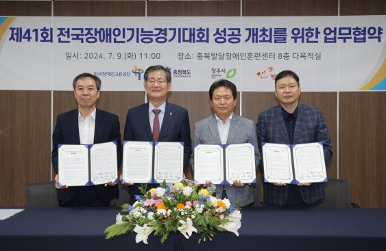 청주시는 9일 한국장애인고용공단 충북발달장애인훈련센터에서 ‘제41회 충청북도 전국장애인기능경기대회’의 성공적인 개최를 위해 충북도, 한국장애인고용공단, 행복모아(주)와 다자간 업무협약을 체결했다.
