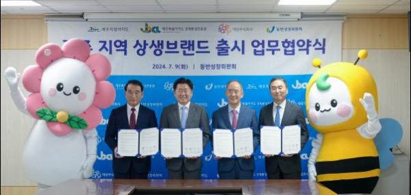 제주도는 9일 오후 3시 동반성장위원회 회의실에서 동반성장위원회(위원장 오영교), 대상㈜(대표이사 임정배), 제주경제통상진흥원(원장 오재윤)과 ‘제주 지역 상생브랜드 출시’를 위한 4자 업무협약을 체결했다.