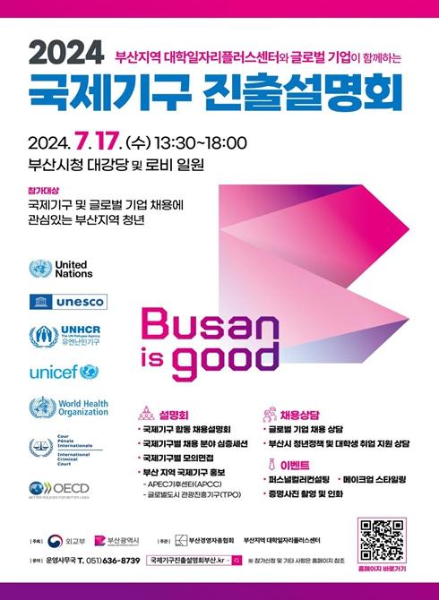 부산시는 오는 7월 17일 오후 1시 30분 부산시청 대강당에서 부산청년과 대학일자리플러스센터, 세계적(글로벌) 기업이 함께하는 '국제기구 진출설명회'를 개최한다고 밝혔다.