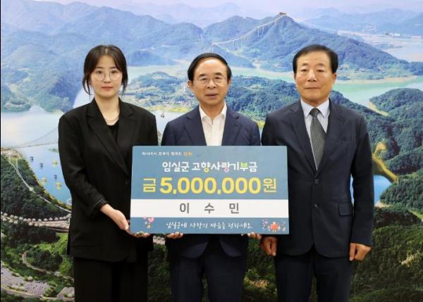 임실군이 지난 9일 이경수 (전)임실새마을지회장의 자녀 이수민 씨가 고향사랑기부금 500만원을 기탁했다고 밝혔다.