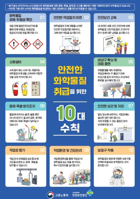 또한, ‘안전한 화학물질 취급을 위한 10대 안전수칙’을 배포하고, 한국배터리산업협회 등 관련 협·단체와 협업하여, 현장에서 10대 안전수칙이 철저히 이행될 수 있도록 안내·촉구할 예정이다.