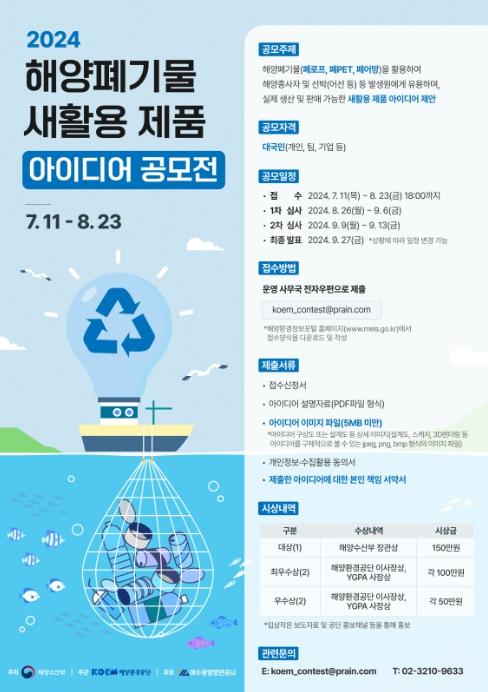 해양수산부는 해양폐기물 저감에 대한 국민들의 인식을 높이고자 ‘2024년 해양폐기물 새활용 제품 아이디어 공모전’을 열고 7월 11일부터 8월 23일까지 아이디어를 접수받는다.