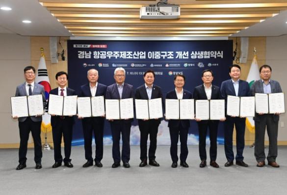 진주시는 10일 경남도청 도정회의실에서 고용노동부, 경상남도, 진주시, 창원시, 사천시와 원청사인 한국항공우주산업(주), 한화에어로스페이스(주), 협력사 대표인 미래항공(주), 삼우금속공업(주)와 경남항공산업 이중구조개선을 위한 상생협약을 체결했다.