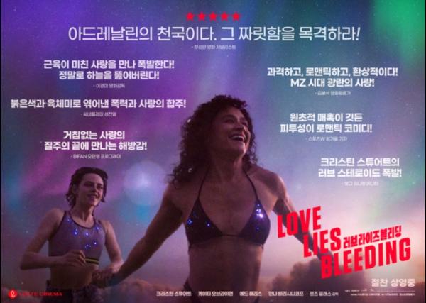 국내외 언론뿐만 아니라 일반 관객까지 모두 사로잡아 파격적인 매력을 선보이는 슈퍼 범죄 로맨스 '러브 라이즈 블리딩'은 절찬 상영 중이다.